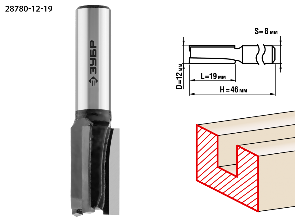 Фреза пазовая прямая, D=12 мм, рабочая длина-32 мм, хв.-12 мм, ЗУБР Профессионал