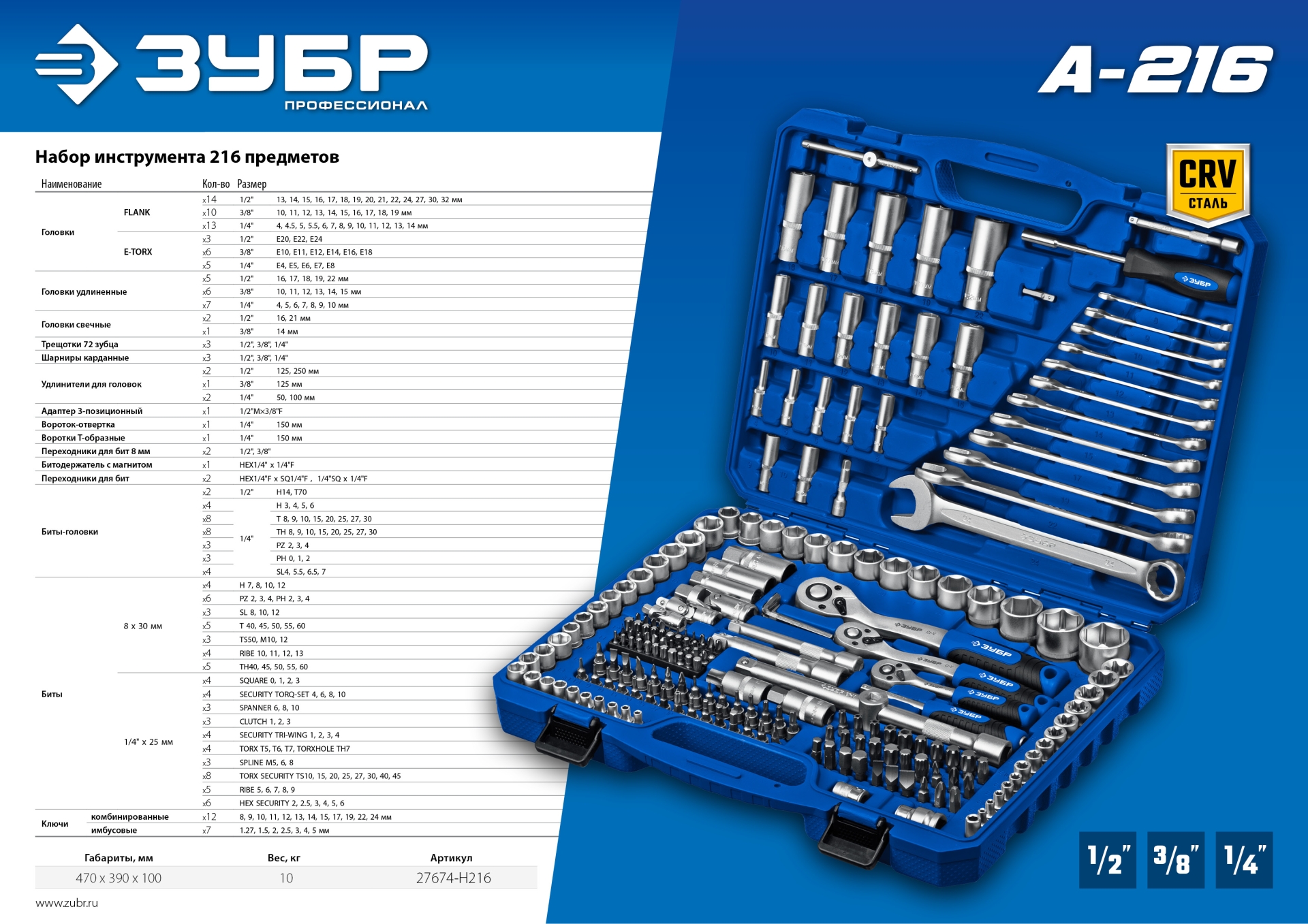 Универсальный набор инструмента ЗУБР 27674-H216, предназначен для работы с крепежом. Хромированное покрытие для защиты от коррозии. Высококачественная Cr-V сталь. Многоступенчатая закалка для придания баланса прочности и твердости. Удобный пластиковый кейс для хранения и переноски инструмента. В комплект входит: