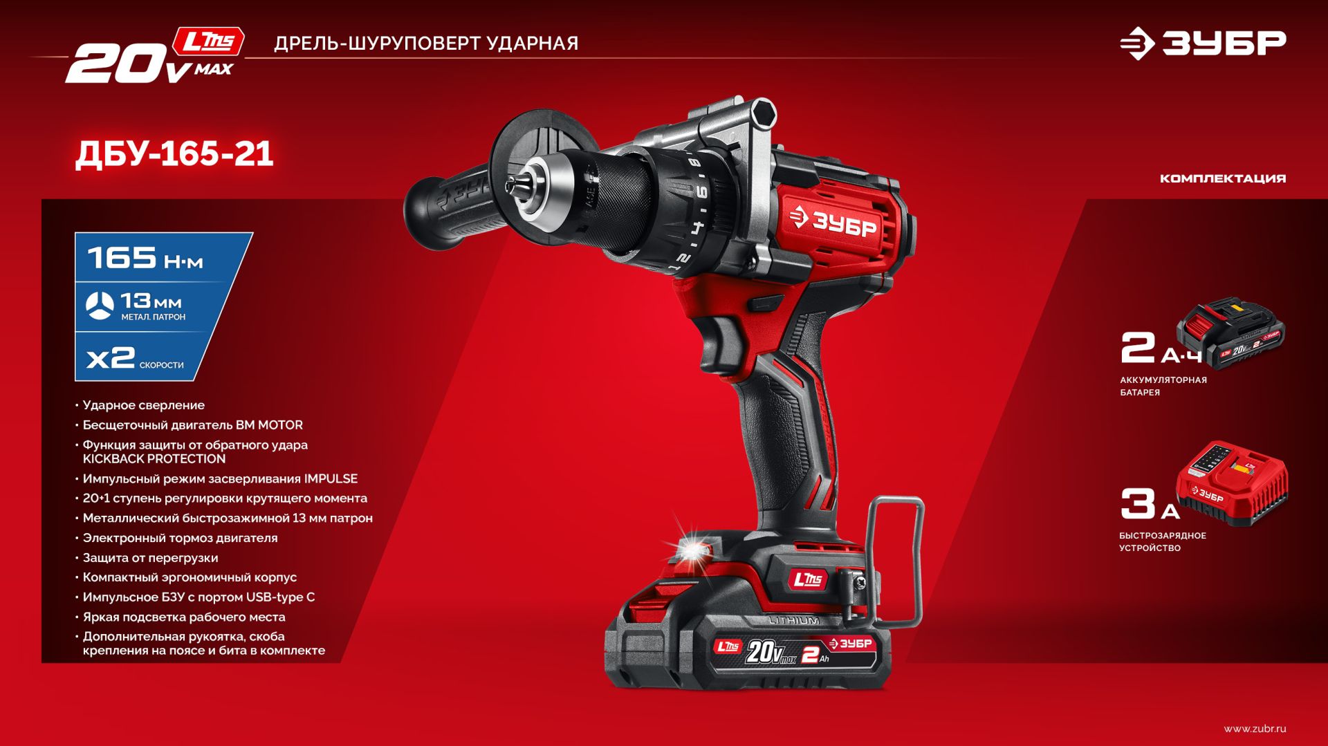 Ударная дрель-шуруповерт ЗУБР ДБУ-165-21, предназначена для сверления отверстий в различных материалах (при установке соответствующих сверл), закручивания/откручивания резьбовых соединений (при установке соответствующих бит), перемешивания ЛКМ (при установке соответствующих насадок).