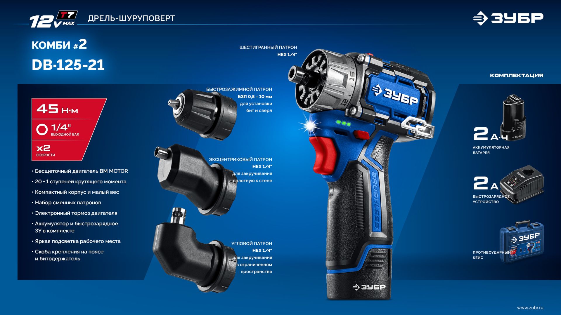 Аккумуляторная дрель-шуруповерт ЗУБР DB-125-21, предназначена для сверления отверстий в различных материалах (при установке соответствующих сверл), закручивания/откручивания резьбовых соединений (при установке соответствующих бит), перемешивания ЛКМ (при установке соответствующих насадок).