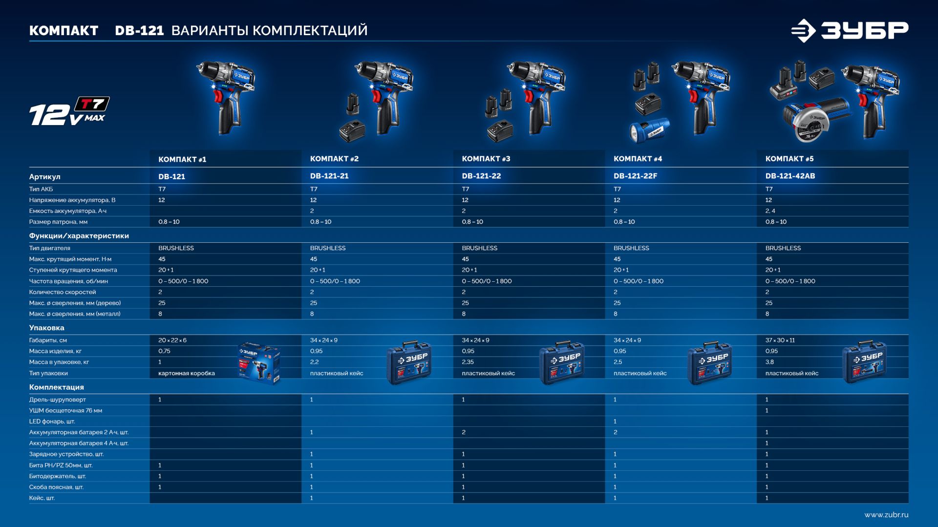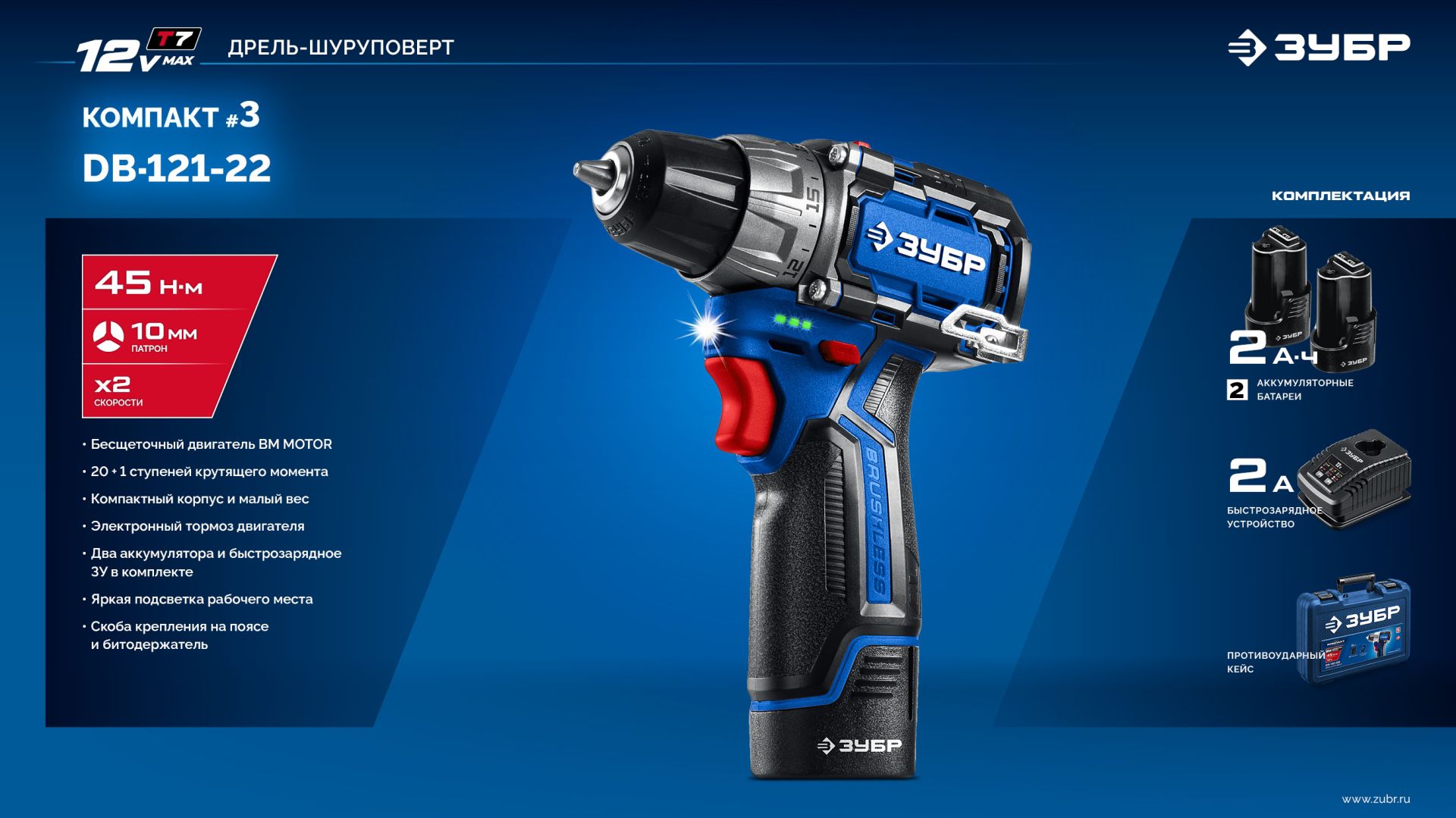 Аккумуляторная дрель-шуруповерт ЗУБР DB-121-22, предназначена для сверления отверстий в различных материалах (при установке соответствующих сверл), закручивания/откручивания резьбовых соединений (при установке соответствующих бит), перемешивания ЛКМ (при установке соответствующих насадок).