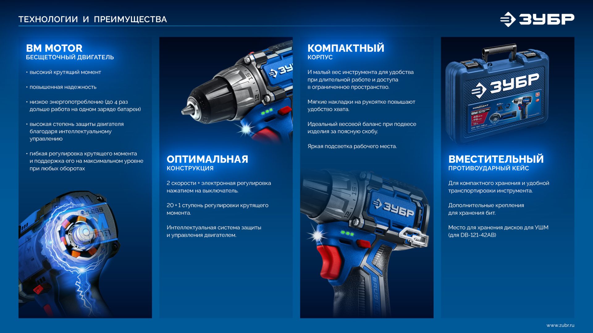 - низкое энергопотребление (до 4 раз дольше работа на одном заряде батареи), - высокая степень защиты двигателя благодаря интеллектуальному управлению, - гибкая регулировка крутящего момента и поддержка его на максимальном уровне при любых оборотах, - отсутствие перекоммутаций в коллекторе и, соответственно, отсутствие нагрева и потерь из-за переходных сопротивлений