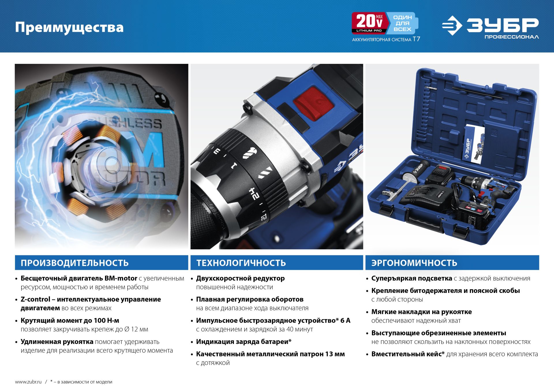 Бесщеточный BM-Motor двигатель обладает целым рядом преимуществ по сравнению с обычным щеточным двигателем: - высокий крутящий момент – в 2 раза выше, чем у аналогичного щеточного двигателя, - высокий КПД благодаря максимально эффективному преобразованию электромагнитной энергии в механическую (ввиду отсутствия перекоммутаций),