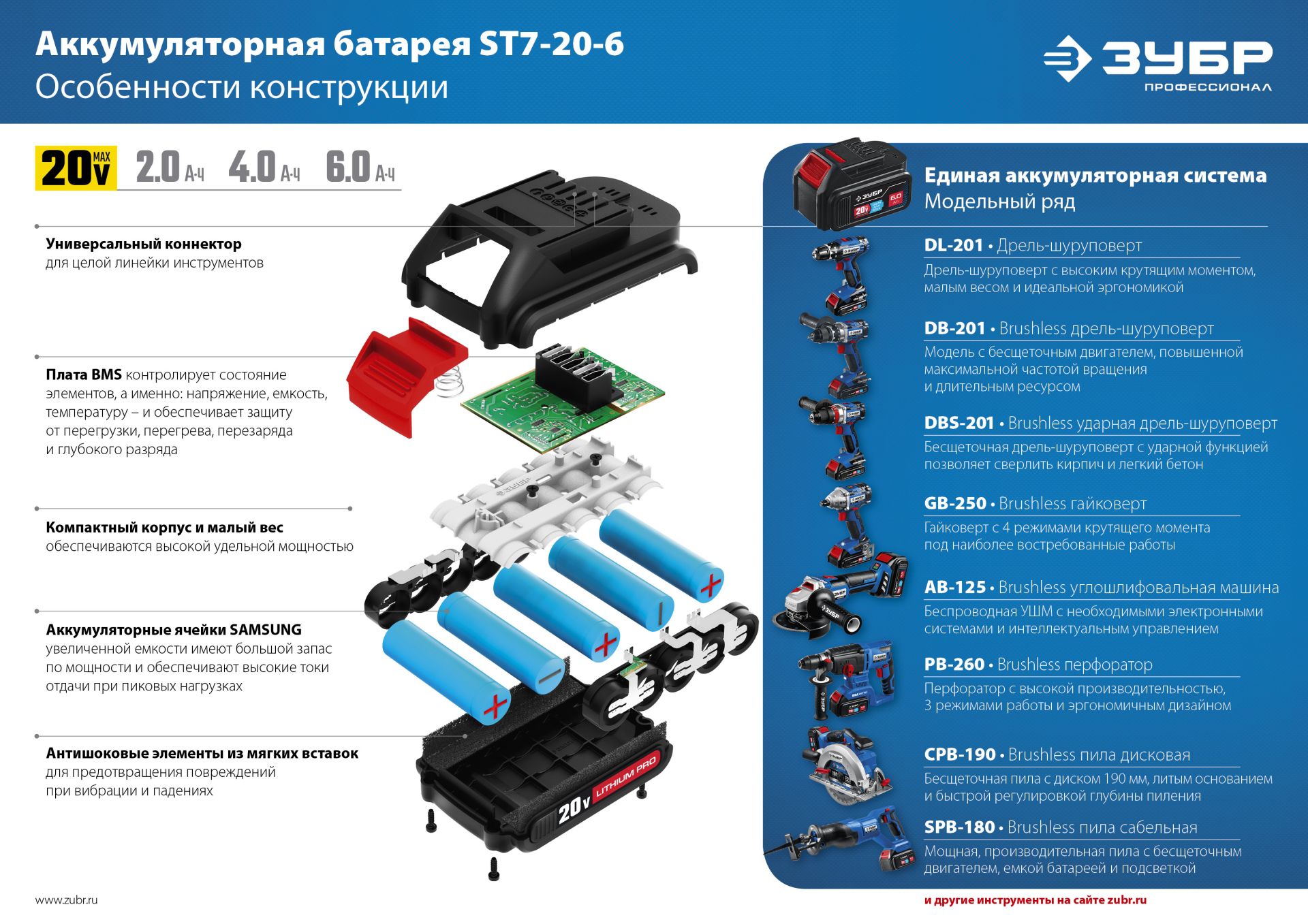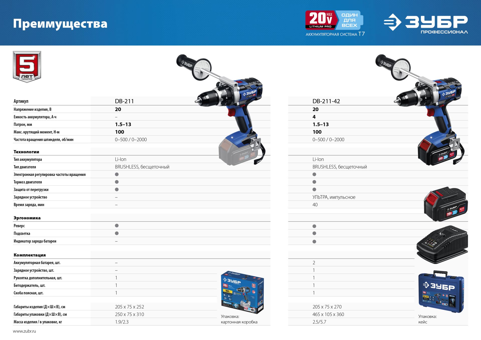 Аккумуляторная дрель шуруповерт ЗУБР DB-211, предназначена для сверления отверстий в различных материалах (при установке сверла), а также для вкручивания/выкручивания шурупов, саморезов и винтов (при установке соответствующих бит), перемешивания ЛКМ (при установке соответствующих насадок). Легко может использоваться в качестве ледоруба для сверления льда для при зимней рыбалке (при условии сверления на 1й скорости, буром правого вращения не более 100 мм диаметром). Бесщеточный BM-Motor двигатель. Высокие крутящий момент и надежность благодаря оптимальному подбору параметров пары двигатель-редуктор. Быстрозажимной одномуфтовый металлический патрон для максимальной простоты и скорости замены расходного инструмента. Широкий диапазон регулировки крутящего момента с равномерным нарастанием момента во всем диапазоне. Подсветка рабочего места не перекрывается патроном. Скоба крепления на поясе и битодержатель устанавливаются с любой стороны инструмента. Единая аккумуляторная система 20V MAX LITHIUM PRO. Бесщеточный BM-Motor двигатель обладает целым рядом преимуществ по сравнению с обычным щеточным двигателем: - высокий крутящий момент – в 2 раза выше, чем у аналогичного щеточного двигателя; - высокий КПД благодаря максимально эффективному преобразованию электромагнитной энергии в механическую (ввиду отсутствия перекоммутаций); - низкое энергопотребление, вследствие чего изделие работает до 4 раз дольше на одном заряде батареи; - высокая степень защиты двигателя благодаря интеллектуальному управлению; - контроллер двигателя позволяет гибко регулировать крутящий момент и поддерживать его на максимальном уровне в широком диапазоне оборотов; - отсутствие постоянных перекоммутаций в коллекторе и, соответственно, отсутствие нагрева и потерь из-за переходных сопротивлений; - повышенная надежность ввиду отсутствия искрения, трения и контактирующих деталей.